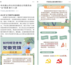 另外,總公司黨委還組織領(lǐng)導(dǎo)班子成員對《中國共產(chǎn)黨黨徽黨旗條例》內(nèi)容進行了學(xué)習,并將如何規(guī)范使用黨旗黨徽的規(guī)定內(nèi)容制作成“云黨課”,下發(fā)各基層黨組織及黨員干部進行學(xué)習。