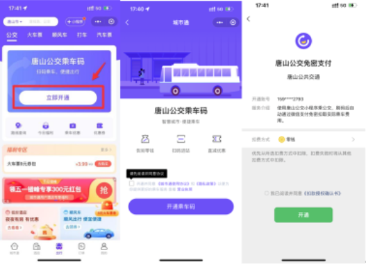 第一種:打開微信,搜索“城市通”小程序,定位到唐山市或者搜索城市列表中的唐山市,選“公交”或“出行”頁面,確認(rèn)開通乘車碼和免密支付后就可以刷碼出行啦,無需每次輸入支付密碼,方便快捷。